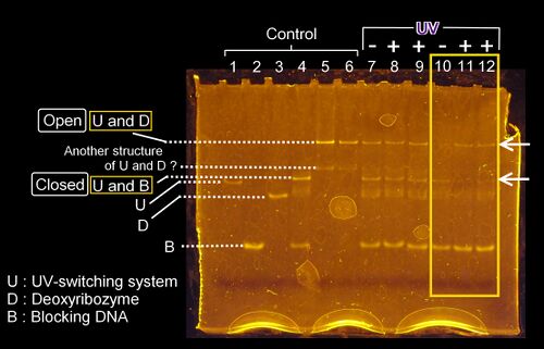 - Before UV irradiation (lane 10), the UV-switching DNA was closed state (band U-B). After UV irradiation (lane 11, 12), the band shifted to the position of hybridized state (band U-D). Thus, the UV-switching device we designed worked successfully as we intended.
