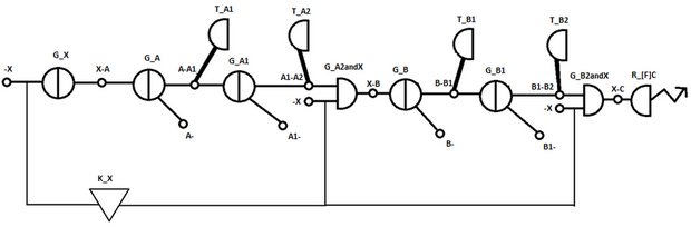 A2ANDX is the initial state of the AND gate A2ANDX:A1-A2 is the intermediate state of the AND gate A2ANDX:-X in the final state of the AND gate when it has released its output X-B
