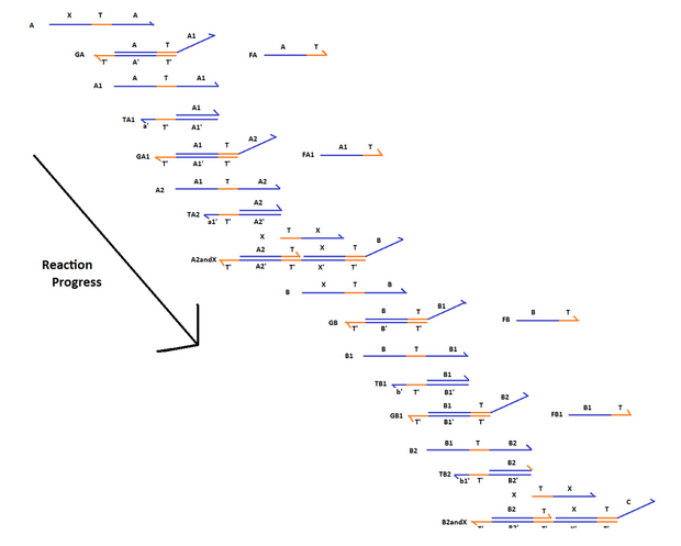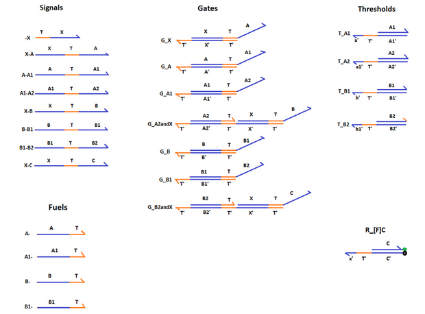 - Gate - contains the reverse complement of the signal. Branch migration between the signal and gate leads to an output signal. Characterized by a compliment domain region surrounded by two compliment toehold regions
