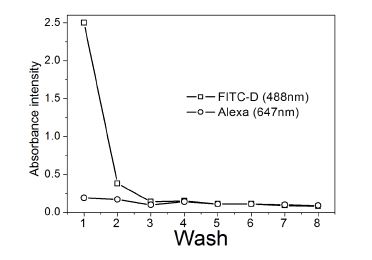 To 50 µL of eIFD105AX containing 2 mM FD10, 150µL of phosphate buffer was added and centrifuged at 3000 rpm at 4°C. The flow-through fractions obtained after subjecting to a CentriconTM, that contained eluted free FD10 was monitored spectroscopically to determine the efficiency of FD10 separation. To this, 200 µL of phosphate buffer was added and the procedure repeated till three consecutive washes showed negligible fluorescence (Figure 4). The wavelengths monitored for each component were 488nm as a measure of FD10, and 647 nm as a measure of any disintegrated DNA capsule. The purification traces showed efficient purification and stable nanocapsules.eIFD1011AX or eIFD105AX were then used further for fluorescence investigations outlined in section 10(iii).