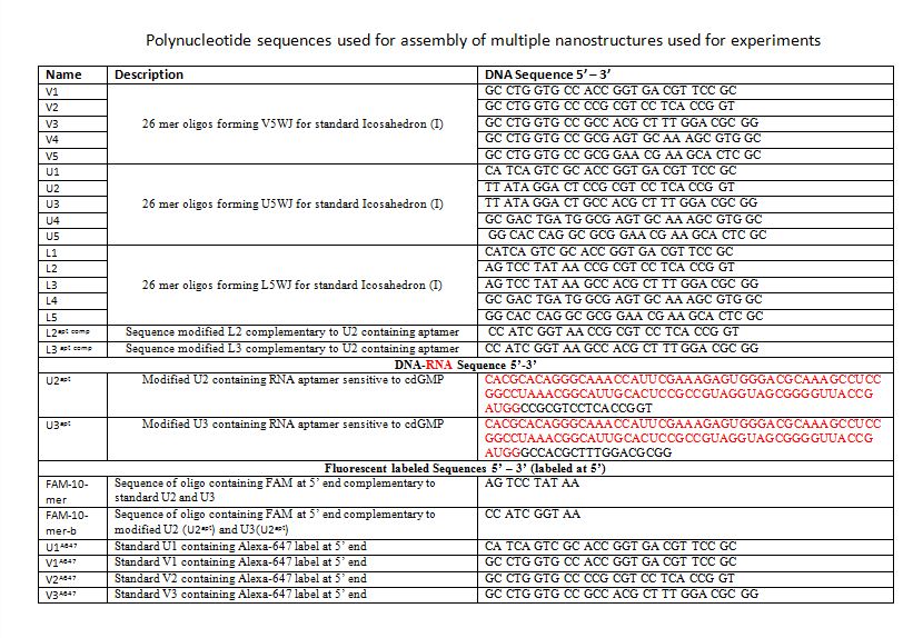 Polynucleotide sequences used for assembly of multiple nanostructures used for experiments