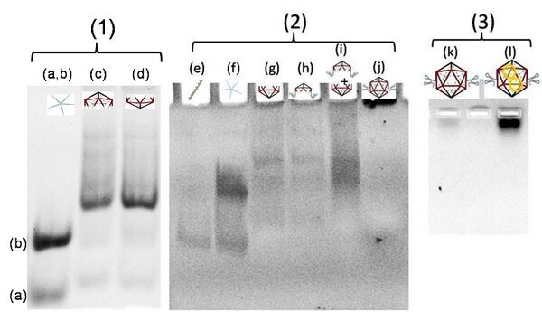 In an eppendorf tube, 50 µL of U5WJ (20 µM) and 10 µL of V 5WJ (20 µM) were mixed to form half icosahedron VU5. The eppendorf tube containing this reaction mixture was heated at 45°C for 4 h, and then the temperature was decreased at the rate of 1°C/3 min till room temperature, where the samples were incubated for 2 h and then stored at 4°C for 72 h. VL5 was similarly made by mixing V and L 5WJs. The half icosahedra were ligated using N-Cyano imidazole (NCI) to increase their stability. The excess residual NCI and nickel phosphate (by-product) was washed by passing through a CentriconTM with 10 kDa cutoff till all the solid precipitate disappears. The half icosahedra were characterized by 8% PAGE stained with EtBr.