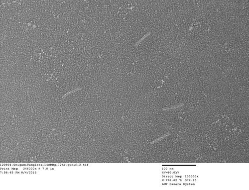 Unfortunately, we ran into a dilution issue after purification to add the L-DNA strands. Because we were seeing promising results with the Large Canvas SST technique, we did not purse DNA origami to completion and have certainly not ruled out origami as a possible template.
