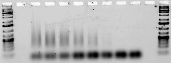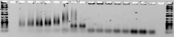 Next, we tested for annealing at a range of temperatures between 30 and 44.5°C to determine the melting temperature of each design(the lowest temperature at which the strands fail to anneal. (Note that in some lanes, e.g. for Ribbon 3, the strands aggregate so much that they remain in the well. Other lanes, e.g. those for Ribbon 5, contain a very faint smear.)