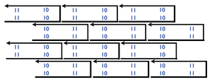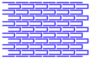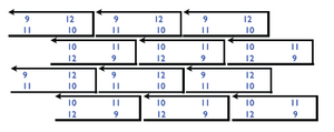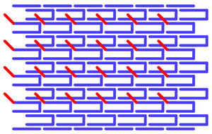The first template we designed was a small (10 helix by 10 turn) canvas designed by Bryan Wei et al (2012). This canvas is made of 66 single stranded tiles (SSTs), 12 of which are protector strands bordering the top and bottom rows. We add handles (shown in red below) to rows 3, 5, 7, and 9 as attachment sites for L-DNA SSTs.