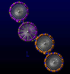 - Gap: The 3' end of the D-DNA SST was shortened by 1 base pair before the handle sequence was attached, to bias the geometry of the handles to point in one direction, as seen by the nanoengineer diagram below and how the one missing base pair at the top left points into the screen, favoring connections on that side.