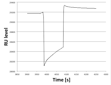 Inject sample 10 μL and start measurement. After end of measurement, inject 10 mM NaOH 5 μL. It is necessary to unify measurement time and RU levels when inject sample.