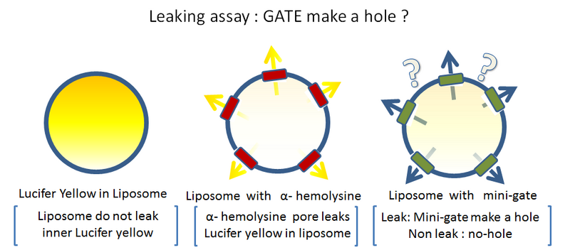 We used fluoresce moelcules to confirm that the tube insert into the liposome. If the mini-gate were inserted into membrane and make a hole on membrane, inner solution without negative charges should be leaked. Lucifer Yellow fluorescein were encapsulated into giant liposome. Leaking was measured by comparing fluorescent intensity between inside and outside of liposome.As a positive control of the leaking assay, alpha- Hemolysin protein was used. alpha- Hemolysin protein is known to make a hole in liposomes. The following figure summarizes the leaking assay.