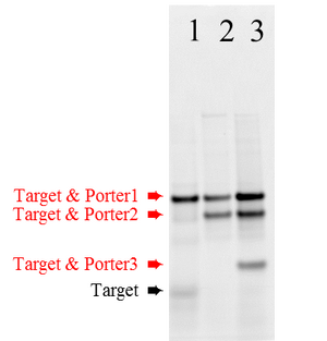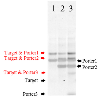 If the target has passed well through Porters, bands of the target hybridizing with Porter1, 2, and 3 should appear. In the gel, bands above each Porter can be seen as the Porter hybridizing with the target.