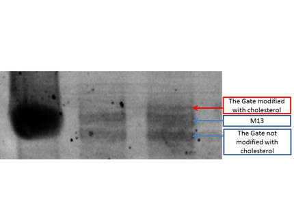 We attached cholesterol to the single-stranded DNA, and confirmed by electrophoresis.