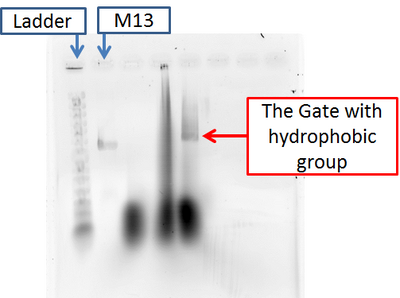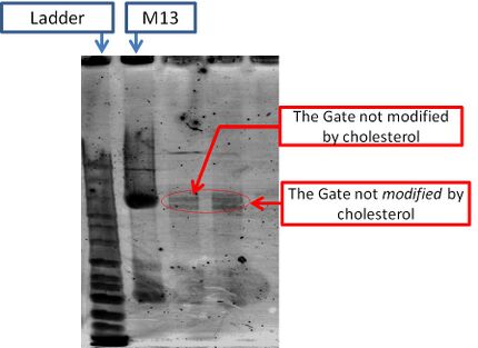 M13 single strand DNA, the GATE, and the GATE mixed with Cholesterol conjugated DNA was loaded on agarose gel. After 1 h electrophoresis at 50 V, DNA were stained by SYBR Gold. By mixing Cholesterol conjugated DNA, a slower migration band appeared. Such a slower migration band were not observed without mixing Cholesterol conjugated DNA. Thus, we concluded, Cholesterol conjugated DNA was introduced to the GATE.