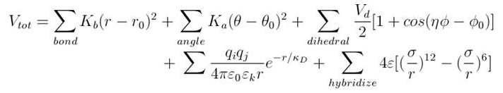 And the latter two terms are non-bonded interactions. Coulomb interactions are taken into account using the Debye-Huckel approximation which enables to internalize counter-ions contribution.