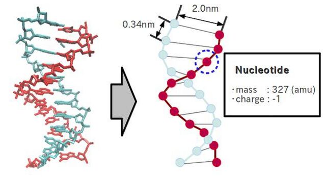 A point-charge model is applied to DNA model. Each phosphate of a nucleotide was converted into one electric beads, which has elementary electoric charge (1.602176565 x 10^−19 [C]). In DNA helix, negative charges appear along the axis of the double helix every 10.4 base pairs.