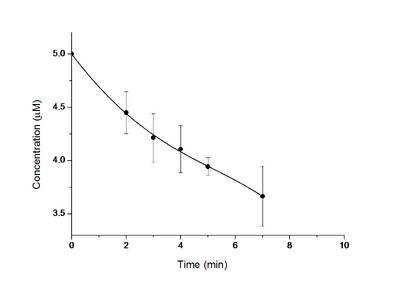 As we can see in Figure 17., the logic gate concentration dropped with the increase of reaction time. This is the first kinetics curve of Cu2+ DNAzyme under the existence of Cu2+ and vitamin C ever measured. The figure showed more details about the kinetics of the self-cleavage of the logic gate. From the number of logic gates that are self-cleavage, we can estimate how many 8-17 are released in the solution . This kinetics figure will help us determine the process of interaction.