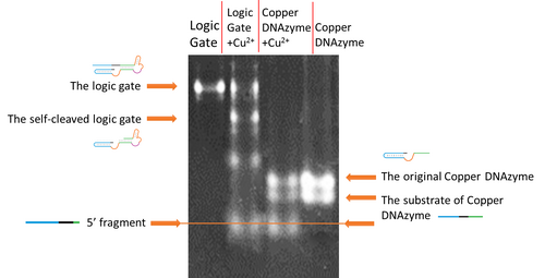 We used PAGE to evaluate the product after cutting with the control group. The logic gate was mixed with DNAzyme buffer and annealed. Cu2+ and vitamin C were added afterwards. Different fragments were separated using PAGE to examine the composition of product. The results were compared with the PAGE of original Cu2+ DNAzyme and substrate. As we can see in the control group, the upper most band is the original Cu2+ DNAzyme, the one next to it is the substrate, the lowest band is one of the cleaved substrate, and the other cleaved substrate are too short to appear in PAGE. As for the experiment group, the upper most band is our designed logic gate, the band next to it is the logic gate after cutting. The lowest one are the same with control group. Finally, the other two band in between may be produced by the nonspecific cleavage due to vitamin C.