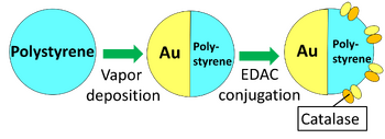 <html><body> <img src="http://openwetware.org/images/5/5a/Catalase_image.jpg" border=0 width=300 height=240></a> For supplying power of Biomolecular Rocket, we experimented with another catalytic engine[1],[2],[3]. Catalase is known as a enzyme that catalyzes the hydrogen peroxide solution. And we expected that this enzyme will be new catalytic engine of the Biomolecular Rocket because a enzyme activity of this enzyme is 100,000 times stronger than that of platinum. In this experiment, we deposited Au for half surface of polystyrene beads and catalase conjugated onto polystyrene side. In addition, we observed a behavior of the beads in diluted H2O2 solution.