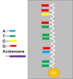 - We incorporated 4 azobenzene units into photoresponsive DNA[1] strand so that we can quickly dissociated DNA duplex. We called it as Photoresponsive DNA sequence S.[5'-AATXACXCCXAGXCC-3' (X=Azobenzene)]