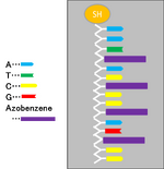 <html><body> <img src="http://openwetware.org/images/7/74/Azoazo.jpg" border=0 width=300 height=240></a> The duplex-forming activities of DNA can be photomodulated by incorporation of an azobenzene unit[1]. The duplex is dissociated on isomerizing the trans-azobenzene to the cis form by irradiation with UV light. The duplex is formed again when the cis-azobenzene is converted to the transazobenzene by irradiation with visible light.