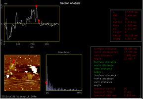 We found that the thickness of the white point in the Shell (Fig.2.2.3.1) was about 4.9nm(Fig. 2.2.3.2). In this picture, the left upper graph shows the sectional pitch that cut Shell perpendicularly. Target DNA is 26 bp or about 5.8 nm, so we estimated that the target DNA hybridized with staple DNA with a little bending.