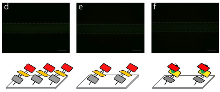 - The fluorescence strength decreased when streptavidin is introduced into the microchannel (f).
