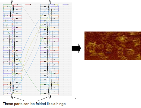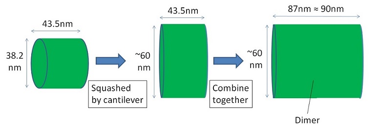 By the figure of AFM, it was figured out that a DNA structure with 60nm long × 90nm wide × 4nm thick was obtained. If this structure had been a flat rectangular, not a cylinder, it would have been 120nm long × 43.5nm wide × 2nm thick. Since the thickness of 4nm is twice of single DNA rectangular and there was no single layered structure near them, it is implied that this structure is a flattened cylinder squashed by cantilever of AFM. The original paper of the cylinder[1] also reported that the thickness of cylinders was around 4nm because they were flattened by pressure of cantilever. However, even if a cylinder gets flattened,the size will be about 60nm long × 43.5nm wide × 4nm thick, volume of which is about half of the observed structure. Therefore, it is considered that the dimers have formed dimers. These dimers are considered to be formed by pi stacking of DNA strands at the end of cylinders. Some cylinders were seen as forming into trimers. The number of trimers was smaller than that of dimers. This is becuase the sub-cylinder formed on one side of the cylinder disturbed the cylinders' connections. To see if they were actually dimers of cylinders, Observation with TEM is required but it is too expensive for us to afford.
