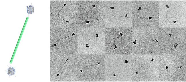 After conjugation and purification of the samples, we checked if the assembly worked properly. Therefore we imaged the solution with the TEM, using the sample preparation method described in the protocols section. Since the structure was designed to bind specifically to a certain spot on the 6HB, the success of the conjugation can be checked easily. In addition to that, the yield of the method can be determined by counting the properly conjugated arrangements by comparing it to the total number of 6HB in the images. At the moment we are able to obtain a yield of roughly 10%, which is still low. Therefore we are currently putting some effort into both improving the used purification method and finding the optimum chemical conditions for the conjugation. Some TEM images of the synthesized structures are shown in the figures below. Therefore we can report specific attachment of nanodiamonds to DNA origami for the very first time.