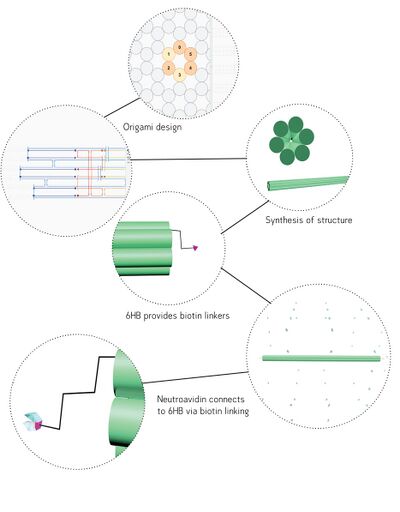 To fulfill all this conditions we choose the structure of a simple 6 helix bundle with biotin anchors on both sides. It was first designed with cadnano and than synthesized in the lab with a PCR-machine. After finishing the synthesis an excessive amount of neutroavidin was added. Finally the free neutroavidin and staples were removed by gel purification.