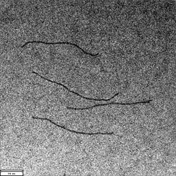 For the scaffold we used a 7560 bases DNA strand of the M13 bacteria where the sequence is known. Based on the known sequence by use of cadnano the staples can be designed to form a 6HB together with the scaffold. One of the staples placed on each end of the 6HB was modified with a biotin group. Finally special designed staples were ordered from "MWG biotech". For more information on cadnano visit: cadnano.org
