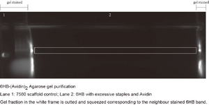 Six hours later we purified the modified structure in order to remove the free staples and the free neutravidin. Therefore we used a 0.7 % agarose gel, which has run for 1.5 hours at 60 V. After running the gel we cut the very left and right band and stained both with SYBR Gold to know where we had to cut the band. We didn't stain the whole gel, otherwise the DNA origami would have started to fluoresce. Then we cut the unstained band and used the "squeeze method" to separate the origami structure from the agarose gel. Finally we confirmed the profile of our structure via TEM measurements.