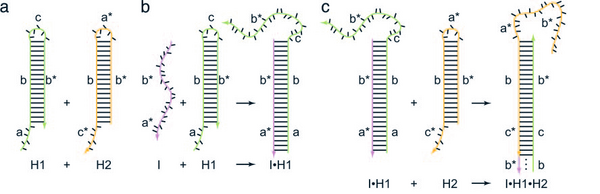 Stable DNA monomers assemble only upon exposure to atarget DNA fragment. In the simplest version of this process, two stable species of DNA hairpins coexist in solution until the introduction of initiator strands triggers a cascade of hybridization events that yields nicked double helices analogous to alternating copolymers. The average molecular weight of the HCR products varies inversely with initiator concentration. Amplification of more diverse recognition events can be achieved by coupling HCR to aptamer triggers. This functionality allows DNA to act as an amplifying transducer for biosensing applications.