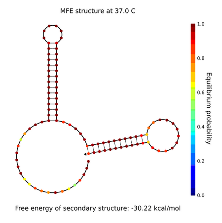 We must protect the tail, so a second stem-loop structure is needed. And we want the second stem-loop structure remain close when not participate in the polymerization reaction, and be open when became one part of the polymer. At first we want to use 2 DNA strands to make it, because the fewer kinds of DNA strand, the easier the reaction taking place. And then, we find it not goanna work if we want to open the strand in the way like origin HCR, the sequence will make the DNA strand all mess up. So we decide to open the 2nd stem-loop structure by itself, just adding a former domain, but this can also change the origin structure like Figure 2.2.2 so we decide to use 4 kinds of DNA strands, and that is or final idea. Figure 2.2.3 is the final design T1 to T4 and Figure2.2.4 is the structure that stimulated by Nupack.