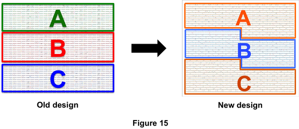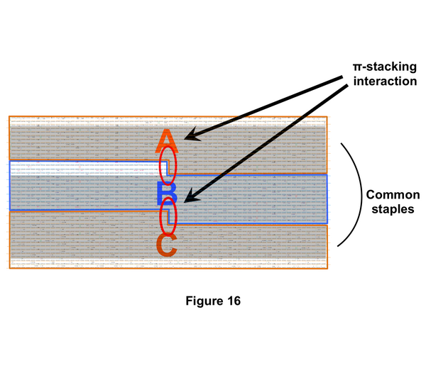 Figure 15 depicts the outline of old design and new design. In old design, the method of formation is connecting 3 kinds of rectangular, the interaction of connecting each origami is only a formation of double helix by joints staple. And furthermore, the area between each origami is acted on a power of electrostatic interaction; it is possible to impede the formation of structure. We considered that only this power couldn’t be stable a structure. It was reported thnat origamis are connected by using stacking interaction with a base of DNA[1]. They made a plan that the design of DNA origami is zigzag joining surface such as jigsaw peace. It has the surface that each origami contacts with the helix direction. Hence, we contrived the innovative design that stacking interaction influences a connection. Figure 16 depicts the points that we thought and worked out of new design. Origami A and origami C are a point-symmetrical structure. To save the money, we designed that staple DNA of origami A, B and C are almost same. As a point at issue of old design, the joints staples of connected each origami are common, the desired structure wasn’t formed. At new design, the sequence of joints staple between origami A and origami B and between origami B and origami C are different. So, these can guard against wayward formation of DNA origami.