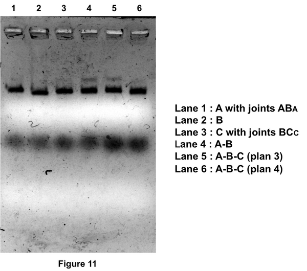 Lane1, 2, 3, 4, 5 and 6 is part A with joint ABA (control), origami B (control), origami C with joint BCC (control), origami A-B, origami A-B-C (plan 3) and origami A-B-C (plan 4). As a result of gel electrophoresis, dimer and trimer of A, B and C were not observed. We can’t explain what was happened in detail, we think that it is because the sequence of joints between origami A and origami B is the same as the sequence of joints between origami B and origami C. So, we studied whether dimer are connected correctly by using agarose gel electrophoresis (1.5% agarose gel, 200 V, 400 mA, 60 min). Figure 12 depicts the image of electrophoresis.