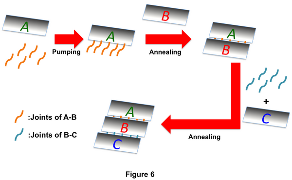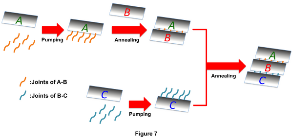 Figure 6 depicts the image of strategy of 1st plan. After each origami is formed, joints AB and origami A were mixed. By pumping the mixture (cooled from 37℃ to 25℃×3), we connected origami A with joints AB. After that, by adding origami B and annealing these (kept at 37℃ for 10 minutes and cooled from 37℃ to 4℃), we connected origami A-joints AB with origami B. Next, by adding origami C and joints BC and annealing these (kept at 37℃ for 10 minutes and cooled from 37℃ to 4℃), we connected origami A-B with origami C. This is 1st plan.