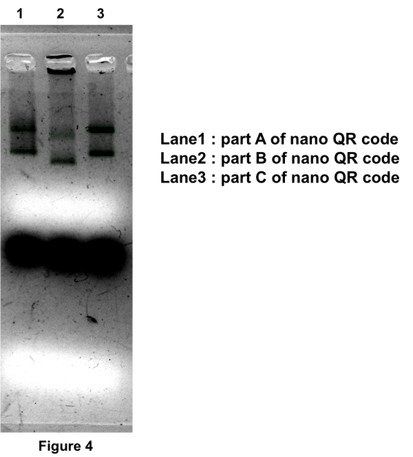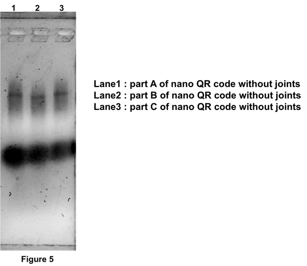 Lane1, 2 and 3 is part A, B and C of nano QR code. Two bands were observed in every lane. We annealed the origami that contained staple DNA of joints. There are possibilities that every origami form tube structure or multimers. We thought that this cause is connecting strands between A and B and between B and C are virtually same. So we excepted joints staples and confirmed whether origami structure is formed correctly by using agarose gel electrophoresis (1.5% agarose gel, 200 V, 400 mA, 60 min) . Figure 5 depicts the result of electrophoresis.