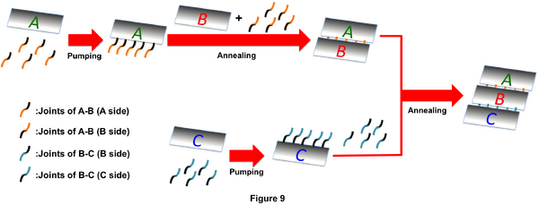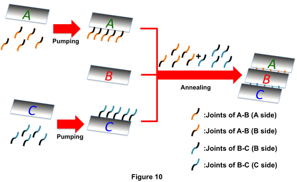 Figure 9 depicts the image of strategy of 3rd plan. After each origami is formed, joints ABA and origami A were mixed. By pumping the mixture (cooled from 37℃ to 25℃×3), we connected origami A with joints ABA. After that, by adding origami B and joints ABB and by annealing these (kept at 37℃ for 10 minutes and cooled from 37℃ to 4℃), we connected origami A with origami B. Next, by adding origami joints BCB and by pumping the mixture (cooled from 37℃ to 25℃×3), we connected origami A-B with joints CBB. Finally, by adding origami C and joints BCC and by annealing these (kept at 37℃ for 10 minutes and cooled from 37℃ to 4℃), we connected origami A-B with origami C. This is 3rd plan.