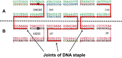 To construct DNA nano QR code uses 3 types of DNA origami. Normally, they have required 600 pieces of DNA staple (200 pieces per one DNA origami). We devised the sequences of Staple DNA, they were shared among 3 types of DNA origami. Thus we required only 359 pieces of DNA staple.