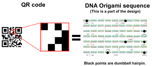 We designed one kind of DNA nano QR code. A black part on QR code is expressed by dumbbell hairpin. The nano QR code is a secret until we create it at nano size.
