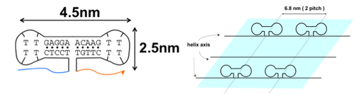To solve it, we designed that  interval of dumbbell hairpins is 2 pitch (6.8 nm) on row direction and 2 helices (6 nm) on column direction.