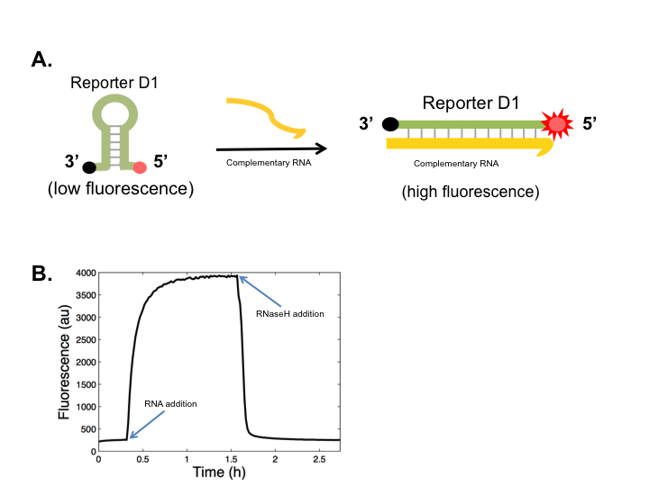 In order to address the need to measure the transcription rates of our systems, we explored alternatives to Spinach and Malachite green aptamer reporter systems. Ideally, addition of a reporter system in to a dynamic circuit like an oscillator, should not overload or perturb the circuit in any way. To achieve this we designed a reporter out of one of the components of our circuits, the DNA strand D1. The original function of the strand D1 is to reactivate inhibited enzymes by removing the inhibiting RNA aptamer (can be seen in this schematic diagram). In other words, it is a 'kleptamer'. Using RNA folding prediction softwares, we found that the single strand D1 is expected to form a hairpin like structure naturally, bringing the 5' end and 3' end closer.