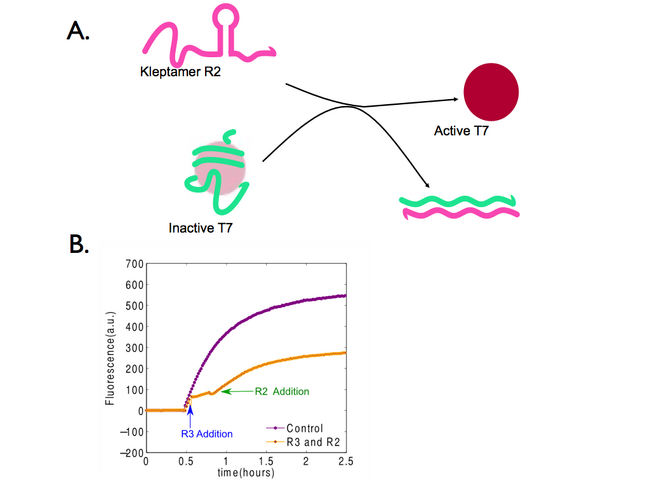 Figure 11-B, shows reactivation of T7 RNA polymerase. In this experiment a gene transcribing the fluorescent Malachite Green aptamer, with a T7 promoter, is monitored. Upon addition of inhibiting aptamer 'R3', the fluorescence flattens out, suggesting inhibition of T7 RNAP. Then upon addition of kleptamer 'R2', the fluorescence starts to increase again. The increase in fluorescence after re-activation is not as clear as SP6 polymerase, but there is certainly an increase in fluorescence after kleptamer addition.