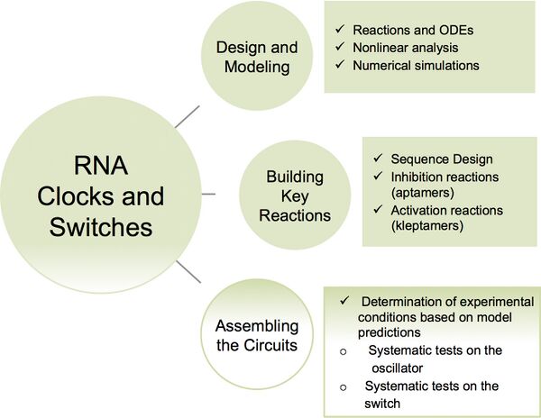 Prior to the official start of the BIOMOD competition, team member Claire H. Tran with graduate students C. Cuba Samaniego and V. Mardanlou and other collaborators had done some modeling and numerical analysis of a much simpler version of these two circuits [1]. That work considered the basic network topology, but reactivation mechanisms mediated by RNA or DNA kleptamers had not been identified; preliminary experimental work involved the light-up aptamer reporter systems, and reproduction of the inhibitory aptamers published in [2, 3].
