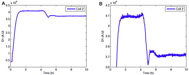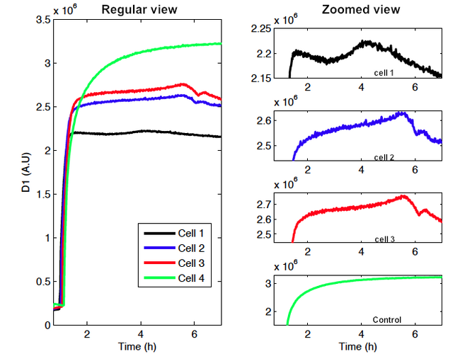 In this experiment, we varied the concentration of RNAse H (which drives degradation of R1) to test its effect on the dynamics of the system. This experiment includes a control sample (Cell 4, green line) that only includes R1 and D1 beacon in transcription mix. This control is needed to rule out the possibility that observed fluorescence fluctuations are due to the instrument.
