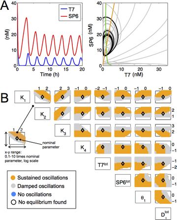 The set of reactions to build the oscillator are more complex than what we saw for the bistable switch. The main negative loop is created by genes g1, which has a T7 promoter and transcribes the SP6 aptamer, and g2, which has the SP6 promoter and transcribes a kleptamer for T7. Gene g3 includes a T7 promoter and produces R3, an inhibiting aptamer for T7, thus creating a self-inhibition loop for T7. Gene g4 includes the SP6 promoter and produces R4, an RNA kleptamer for SP6, thus creating a self-activation loop for SP6. The complexes R1R4 and R2R3 are inert, so we treat them as waste that does not participate in other reactions. We also added a DNA kleptamer D1, which titrates R1 and mediates its degradation in complex D1* by RNase H. This reinforced degradation has been added after inspection of the model revealed that in its absence the system would reach a state where both enzymes were completely inactive. The reactions and the corresponding ODEs are listed in the Supplement.