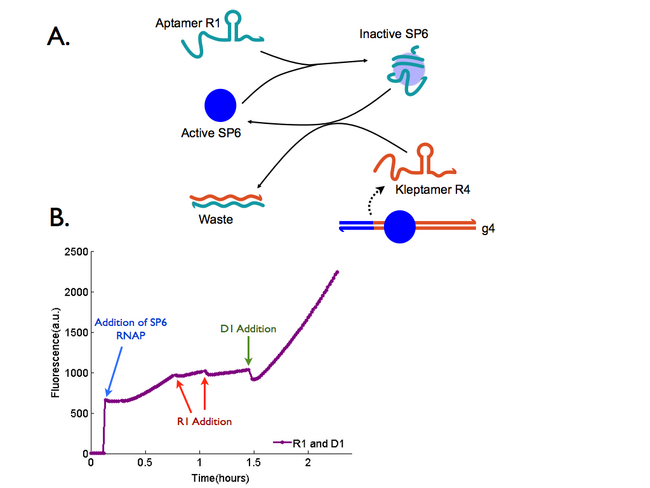 Tools to inhibit RNA polymerases are not sufficient for construction of RNA clocks and switches. It must also be possible to reverse this inhibition. The following experiments show unequivocally that the kleptamers can successfully re-activate aptamer inhibited RNA polymerases. Figure 10-B, shows reactivation of SP6 RNA polymerase. In this experiment a gene transcribing the fluorescent Spinach aptamer, with a SP6 promoter, is monitored. Upon addition of inhibiting aptamer 'R1', the fluorescence flattens out, suggesting inhibition of SP6 RNAP. Then upon addition of kleptamer 'D1', the fluorescence shoots up again.