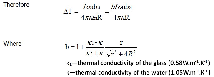 The temperature increase on the surface of a spherical gold NP can be calculated by using the following equation.