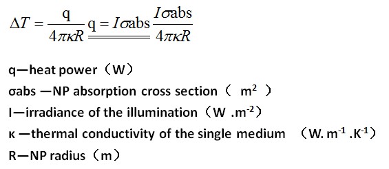 According to the formulas got above, the dependence amongst the intensity, wave length of the illumination, the size of the nanoparticle and the local temperature increase around a nanoparticle become quantative. Then we are able to select the light source needed for certain temperature increase. For instance, if we use a laser whose wave length is 520nm and intensity is 2.7×105W/cm-2 to irradiate a 40nm-gold nanoparticle, the local temperature of the nanoparticle will be 70°C.