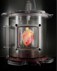Heart tissue is among the densest in the body, and it one of the few organs that cannot repair itself. As a result, there is a high demand for heart (tissue) replacements. However, it is difficult to acquire a healthy heart that is a biological match to the donor. Engineering viable cardiac tissue presents an opportunity to meet the demand of patients. The heart undergoes continuous contractions and electrical currents through its lifetime presenting a challenge to those who wish to replicate its properties in a tissue culture. A recently published paper studied the effects of in vitro simultaneous mechanical and electrical stress on cardiomyocytes. Mechanical stress was supplied in the form of continuous static stress, and electrical stress through current stimulation at a 5 ms pulse. They reported increased cellular alignment, cardiomyocyte hypertrophy and increased passive stiffness of the tissue. Their findings suggest cardiac tissue should be cultured with both electrical mechanical stimuli in order to grow better quality heart tissue[9,10]. Another study attempted to directly seed a decellularized heart in a custom perfusion bioreactor with cardiomyocytes derived from induced pluripotent stem cells, seen in Figure 3. Mechanical stimulation was applied by changing the vessel's internal pressure. This study was able to partially regenerate cardiac tissue that was both electrically and mechanically active after a two week culture period [9]. Currently, rotating-wall bioreactors provide conditions that optimize cardiomyocyte growth. The low levels of shear stressed experienced by the cells in this evironment is cruicial to the development of cardiac tissue, as the cardiomyocytes can be harmed by shear stresses of 0.1 Pa. Laminar flow, but not turbulent flow, can provide a shear stress of 0.001 Pa, which is the preferred stress condition by these cells [1]. Fixed-wall bioreactors and rotating-wall bioreactors both create laminar flow, however the former can also create turbulent conditions through agitation as well [1,]. The exception to the undesirable turbulent conditions in a fixed-wall reactor is the perfusion reactor. Direct perfusion in a reactor better distributes cells along the scaffold, creating a more uniform and stronger tissue [1,].
