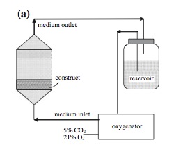The perfusion system offers an alternative to the spinner flask technology as it combats the problems related to the static culture conditions. Typically, static media does not provide optimal cell growth and thus deters the cell’s ability to migrate into the scaffold. This results in a shell formation of cells on the exterior of the scaffold instead of a desired uniform distribution.[2] Perfusion systems constantly replenish the cells with fresh media with the use of chambers, columns, or cartridges that house the scaffold constructs.[2] The constant replenishment of media enhance nutrient delivery to the cells and help the cells to better differentiate. One of the proposed disadvantages of the perfusion system is the constant flow of media causes the cells to line up parallel to the scaffold lining while in certain systems, it would be preferred to orient the cells perpendicularly, such as articular cartilage.[2]