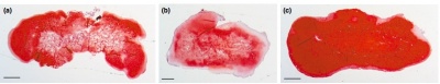 The initial control was a static culture construct. In the first illustration, it is evident that GAG was able to be produced in the outer regions but do appear in the central regions of the tissue.[1] The first test was to use the spinner flasks for the tissue culture. In this culture it is evident that the media mixing allows for better production of GAG through the central areas of the tissue. It is clear that there is a more level distribution of the GAG production in the cartilage tissue cells. The second test was the implementation of a RWV bioreactor. In this test, it is evident that the lack of shear stress and better mixing at equilibrium generated a much more intense GAG concentration throughout the tissue sample.[1]